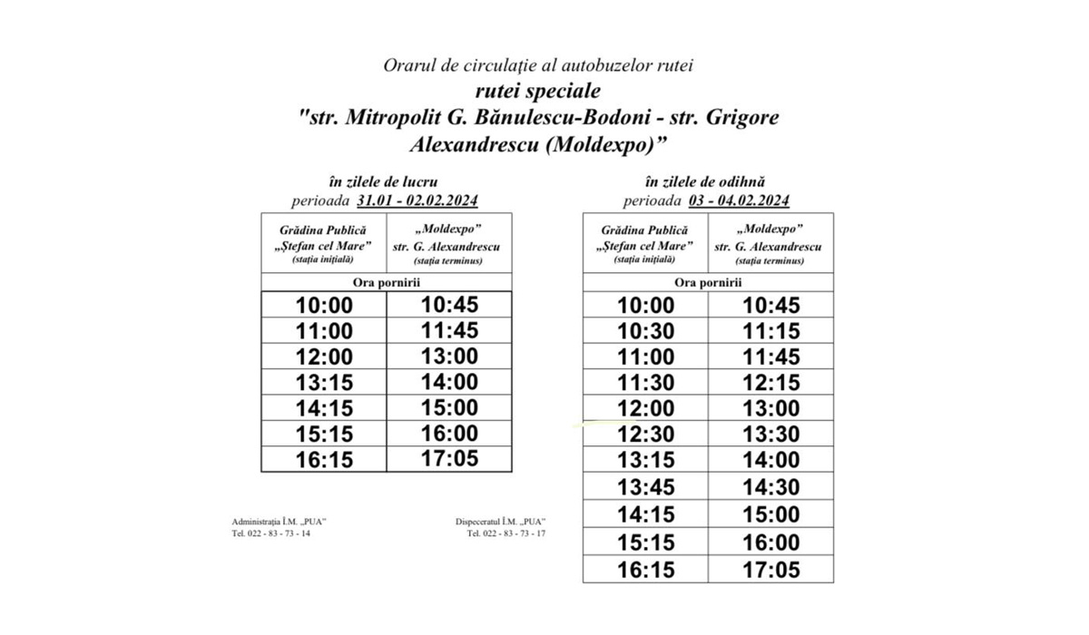 În perioada 31.01.2024 – 04.02.2024, între orele 10:00 – 17:00, va activa ruta temporară de autobuz „Grădina Publică Ștefan cel Mare și Sfânt – Centrul Internațional Expozițional „MOLDEXPO”, pentru transportarea cetățenilor și oaspeților capitalei către pavilioanele Expoziției „Fabricat în Moldova”.