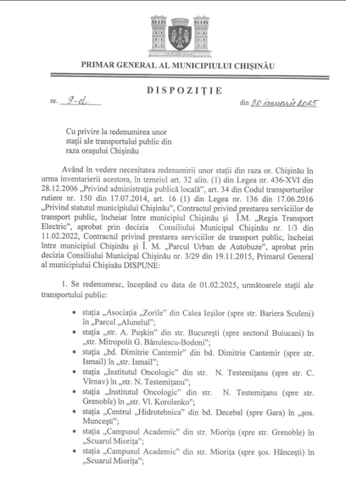 Primăria Municipiului Chișinău informează că, începând cu data de 1 februarie 2025, vor fi redenumite mai multe stații ale transportului public din raza municipiului.