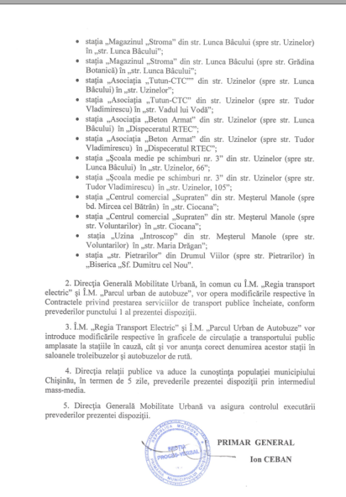 Operatorii municipali de transport: Î.M. „Regia transport electric” și Î.M. „Parcul urban de autobuze” vor actualiza graficele de circulație și vor reflecta noile denumiri pe panourile informative amplasate în stațiile respective.