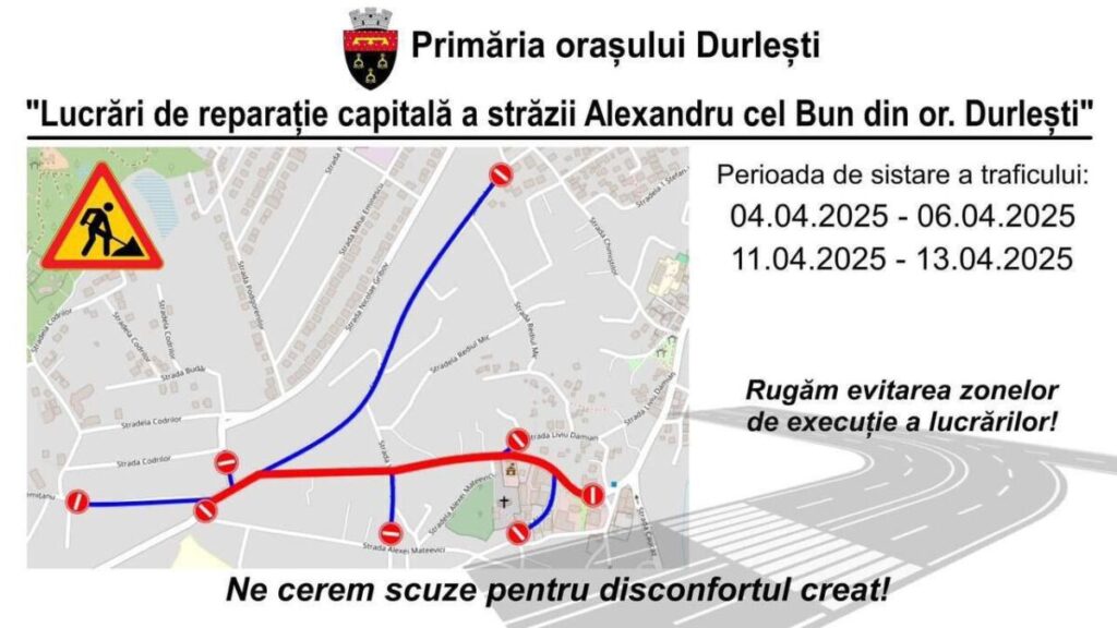 Primăria Chișinău informează că, în zilele de 4, 5, 6, 11 și 12 aprilie 2025, traficul rutier va fi suspendat pe str. Alexandru cel Bun, pe tronsonul cuprins între str. Livezilor și Nicolae Testemițanu din orașul Durlești.