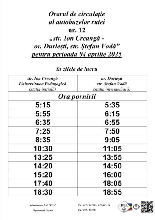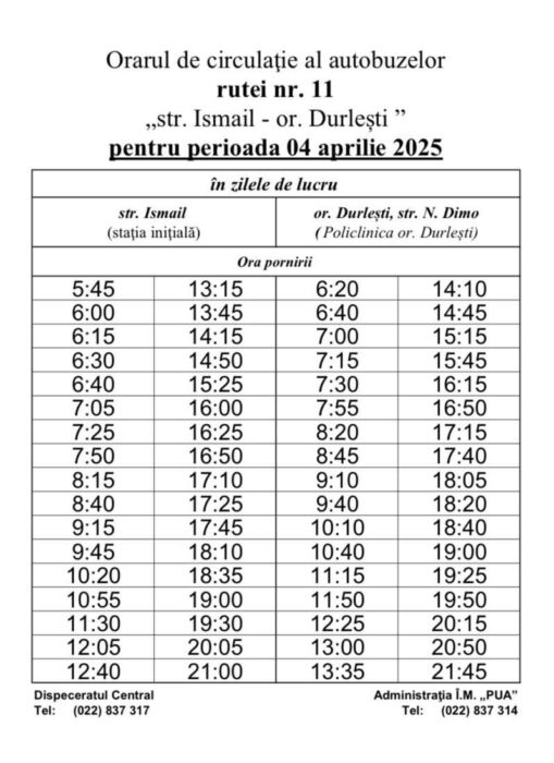 Ca urmare, itinerarele rutelor de autobuz nr. 11 și nr. 12 din orașul Durlești vor fi redirecționate după cum urmează: