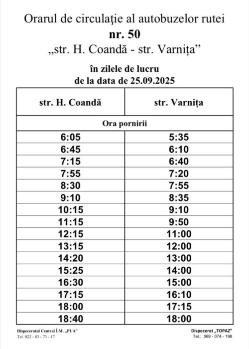 Având în vedere numeroasele solicitări parvenite din partea locuitorilor din strada Varnița și strada Calea Moșilor, Primăria Municipiului Chișinău anunță lansarea, cu titlu de proiect pilot, a rutei de autobuz nr. 50 “str. Henri Coandă – str. Varnita”, cu următorul itinerar: