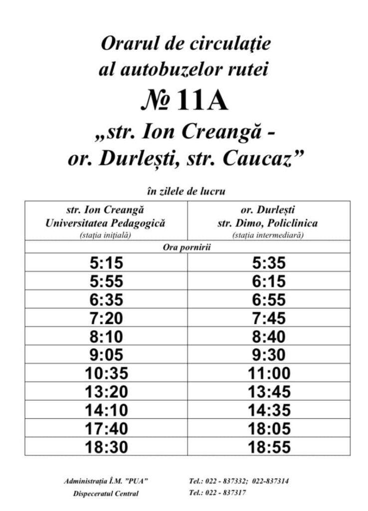 Începând cu data de 04.09.2023, se instituie ruta suburbană de autobuz nr. 11A „str. Ion Creangă – str. Caucaz, or. Durlești”