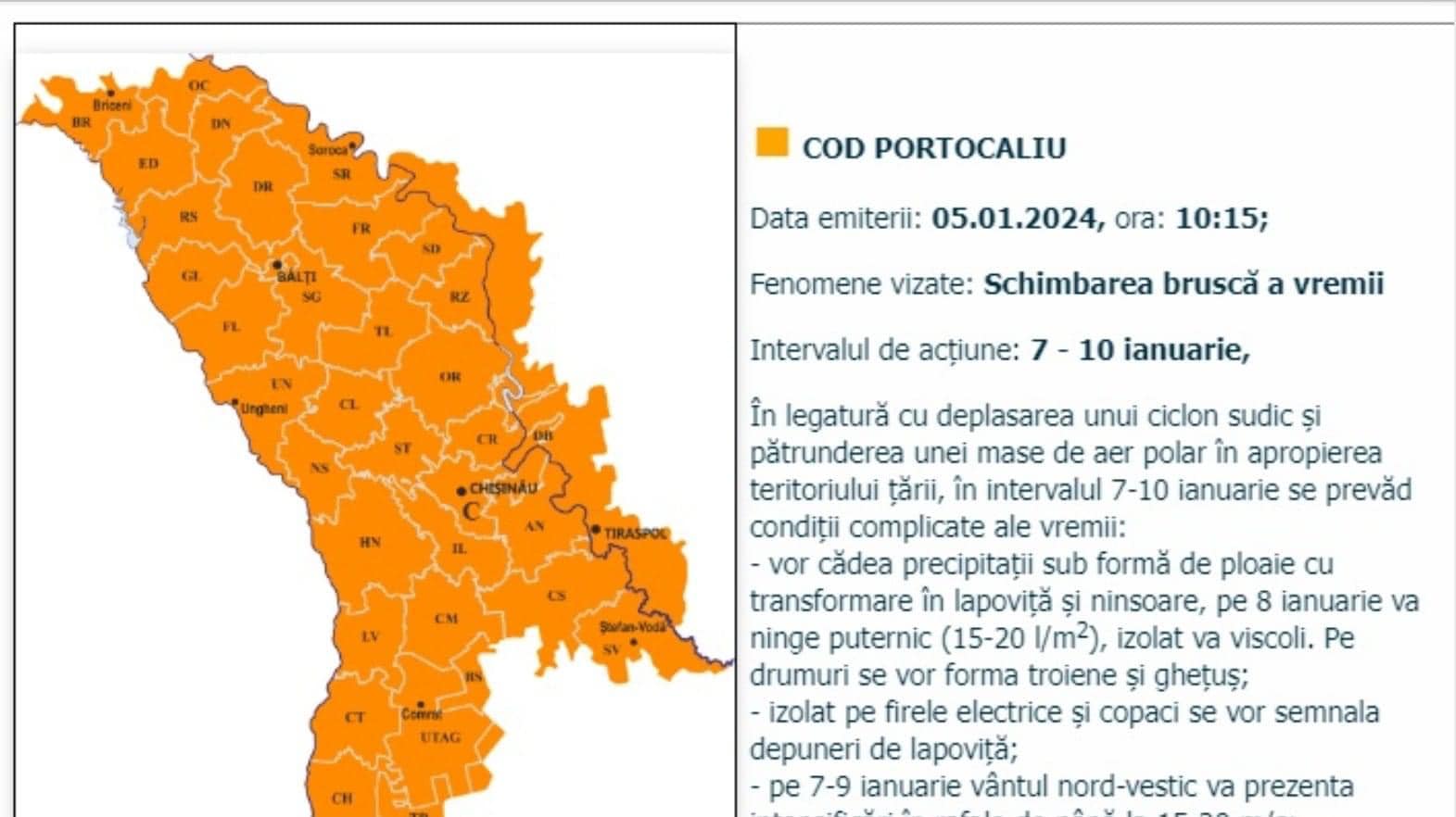Primăria Municipiului Chișinău atenționează cetățenii în contextul avertismentelor de schimbare bruscă a vremii în perioada 7-10 ianuarie 2024 şi emitere a codului portocaliu de cădere a precipitațiilor abundente.